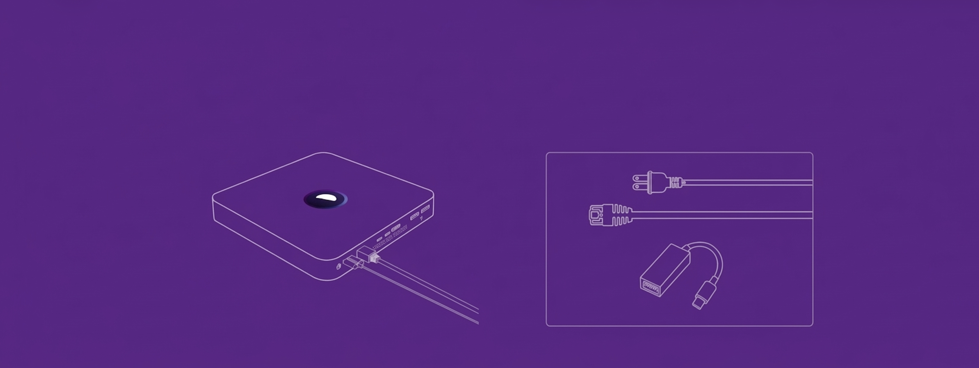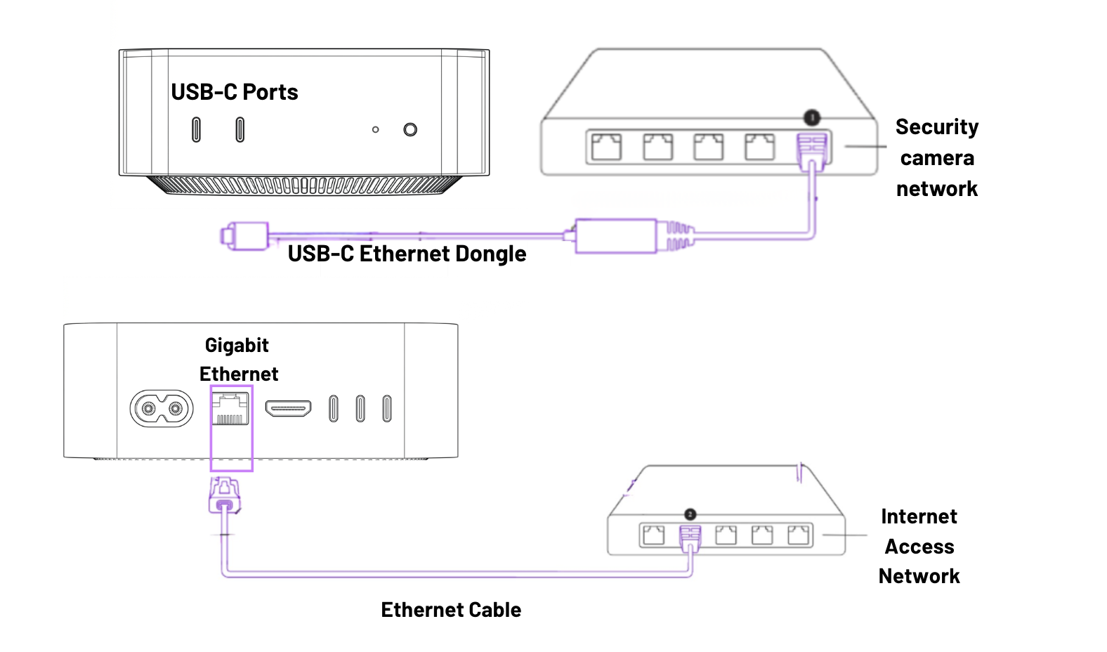 2 (b). For a dual-homed configuration (necessary if your camera network is separate from your Internet access network), plug the USB-C Ethernet dongle into an available USB-C port on the front of the base station - the same side as the white power LED.