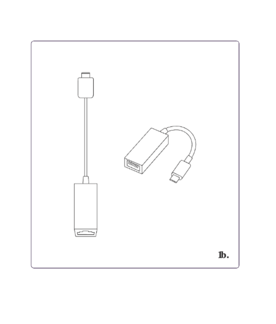 Shown is a sample USB-C to Ethernet adapter (aka dongle). If you are setting up a dual-homed configuration (separate camera and Internet networks), you will need a USB-C Ethernet dongle. If applicable, unpack it now.