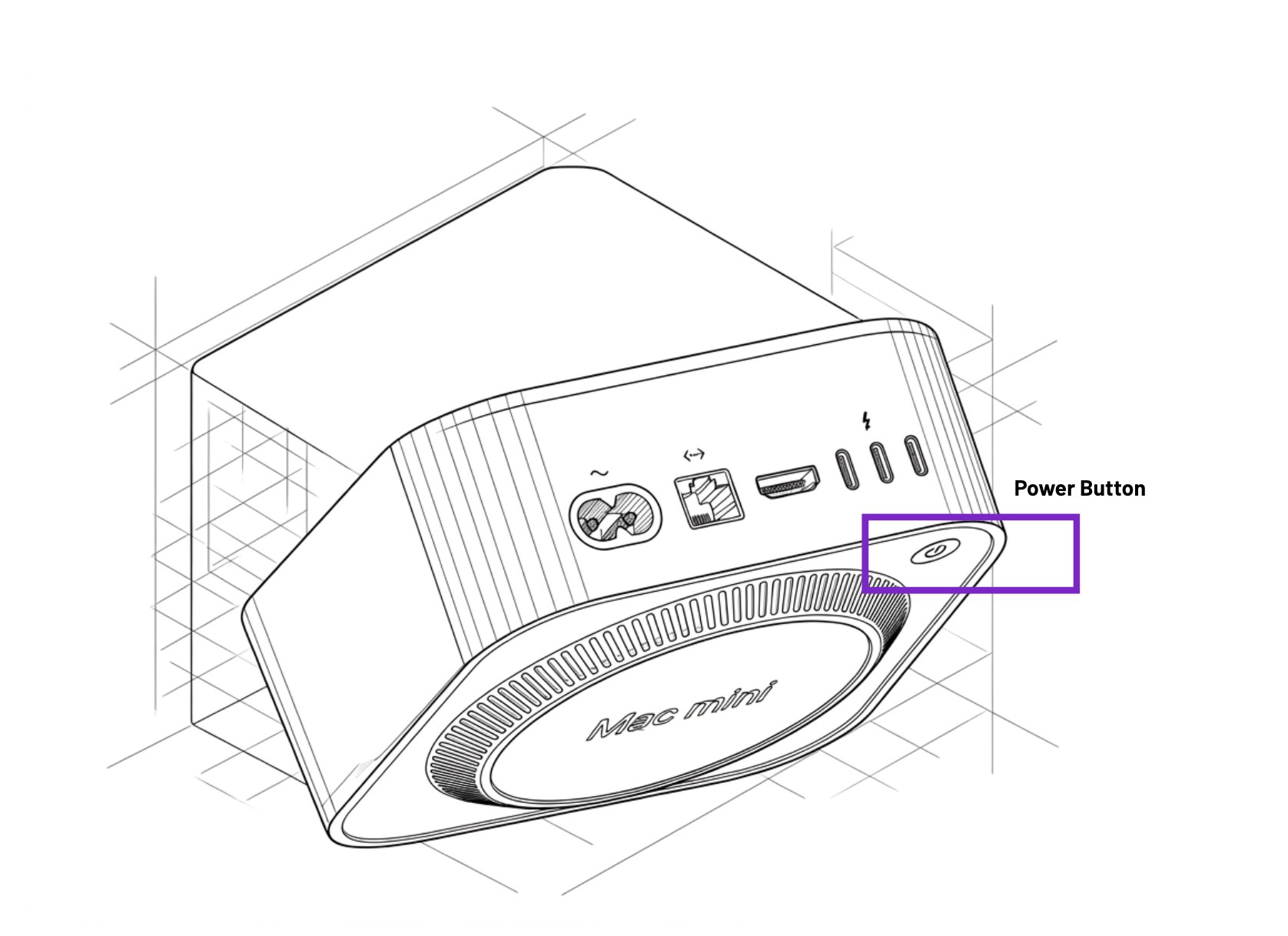 Use the power button located on the base station to turn it on. On older Mac Mini models (M1/M2), the power button is located at the back left, while on newer M4 models, it is located on the bottom of the device.