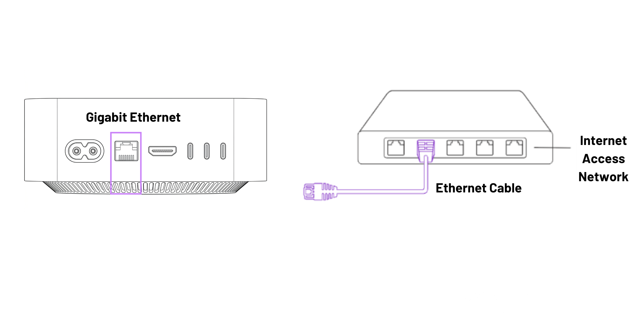 ⚠️ CAUTION: Booted (jacketed) RJ-45 cables can sometimes fail to seat fully in the M4 Mac Mini’s Ethernet port because the port is slightly recessed behind the outer chassis. Even a minor difference in boot height or stiffness can prevent the latch from engaging cleanly, leading to intermittent or unreliable link detection. For consistent installs, we recommend using non-booted cables, or trimming/modifying the boot on one end without damaging the connector itself.